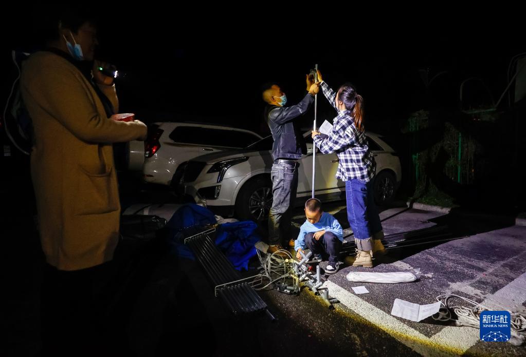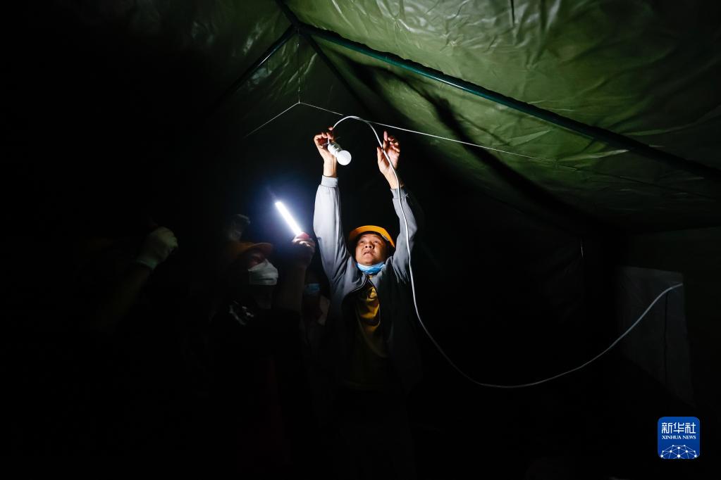 9月5日晚,在四川甘孜州瀘定縣磨西鎮的受災群眾(zhong) 臨(lin) 時安置點,工作人員安裝電燈。新華社 沈伯韓 攝