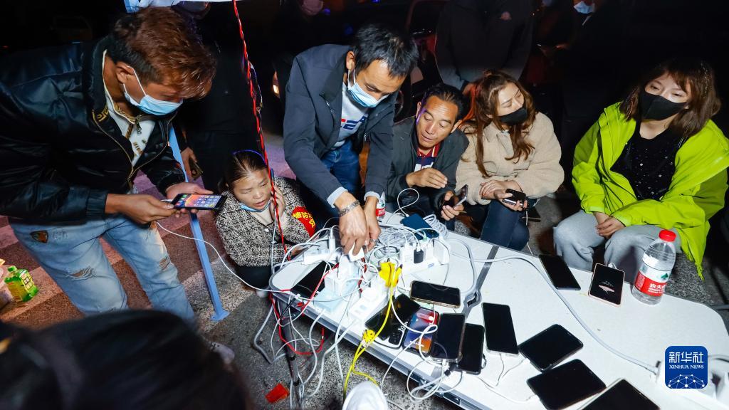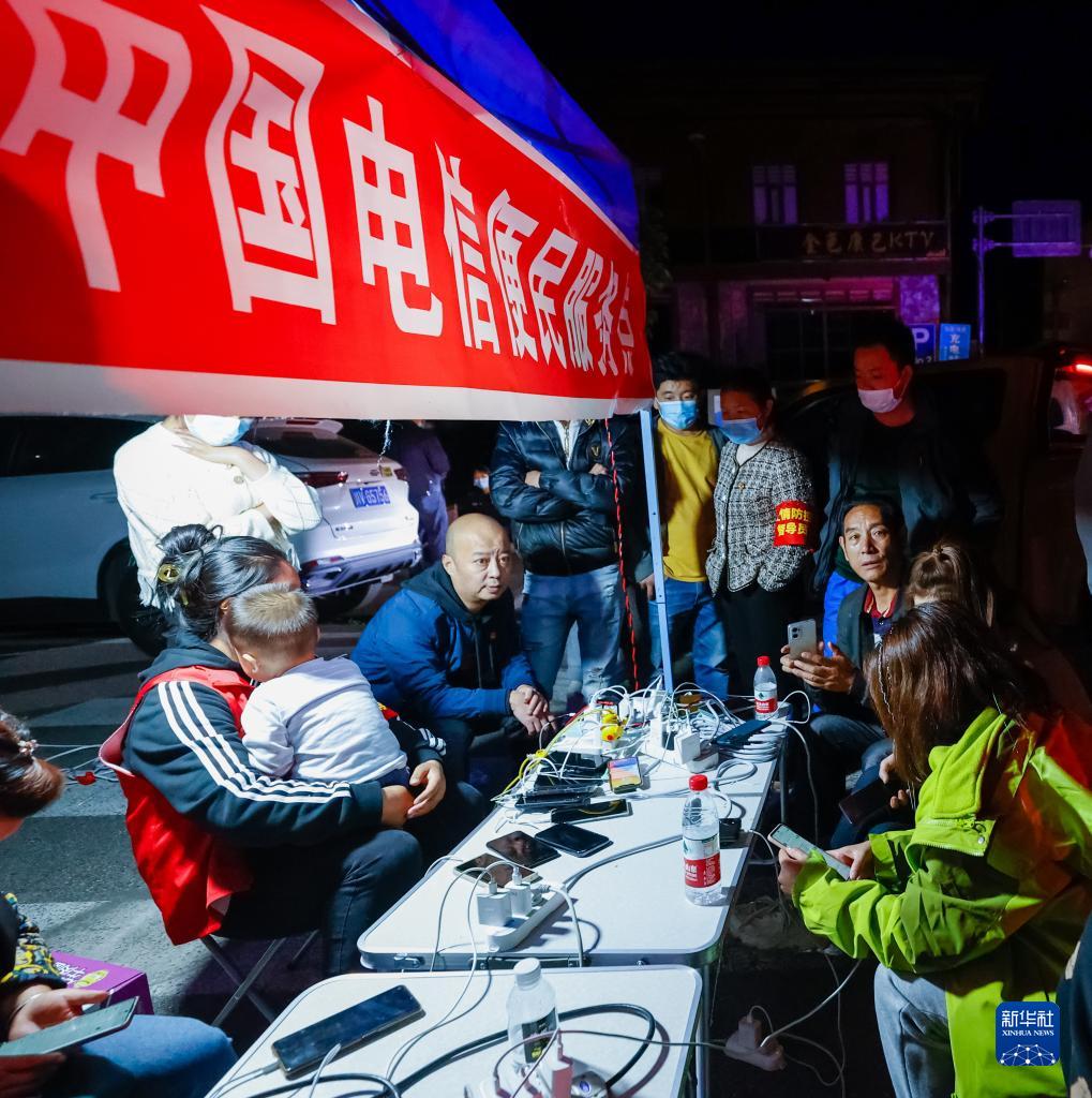 9月5日晚,在四川甘孜州瀘定縣磨西鎮的受災群眾(zhong) 臨(lin) 時安置點,人們(men) 在中國電信便民服務點為(wei) 手機充電。新華社 沈伯韓 攝