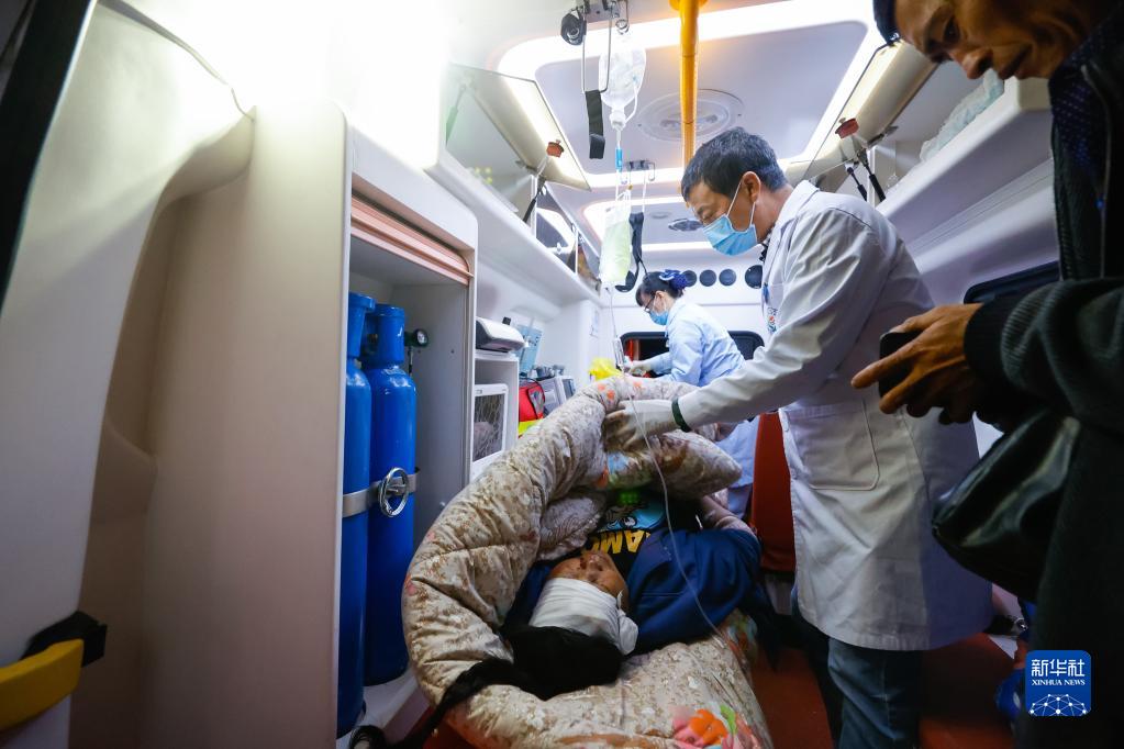 9月5日晚,在四川甘孜州瀘定縣磨西鎮的受災群眾(zhong) 臨(lin) 時安置點,醫務人員在轉運傷(shang) 員。新華社 沈伯韓 攝