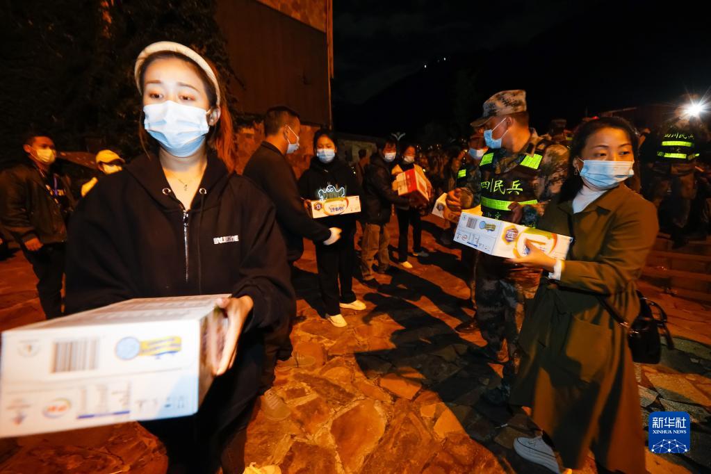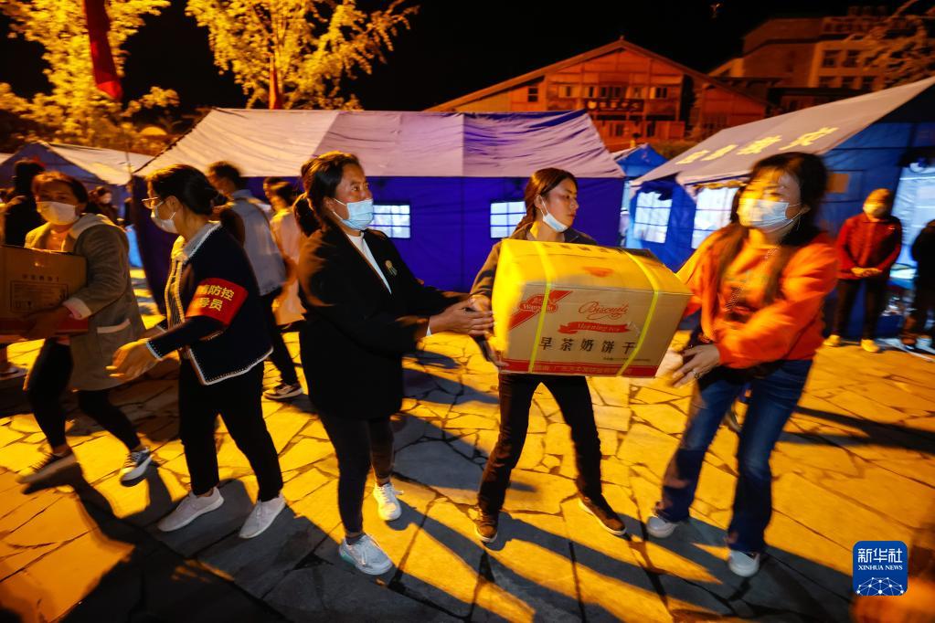 9月5日晚,在四川甘孜州瀘定縣磨西鎮的受災群眾(zhong) 臨(lin) 時安置點,人們(men) 在傳(chuan) 遞救災物資。新華社 沈伯韓 攝