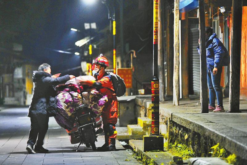 在燕子溝鎮新興(xing) 老街,搜救排查發現一戶群眾(zhong) 房屋存在危險,消防隊員馬上幫助住戶收拾棉被和衣物,將其轉移到安置點。