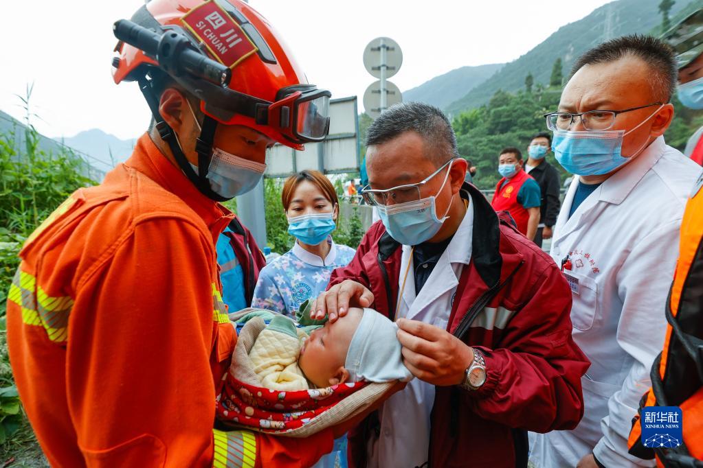 9月6日,阿壩森林消防支隊汶川大隊隊員張自立將一名從(cong) 瀘定縣得妥鎮灣東(dong) 村疏散出來的2個(ge) 月大的嬰兒(er) ,交給瀘定縣人民醫院醫生。新華社記者 沈伯韓 攝