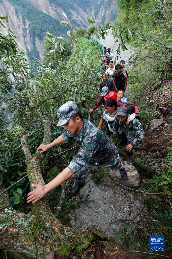 9月6日,救援人員幫助瀘定縣得妥鎮灣東(dong) 村村民攀爬高山向外疏散。新華社記者 沈伯韓 攝