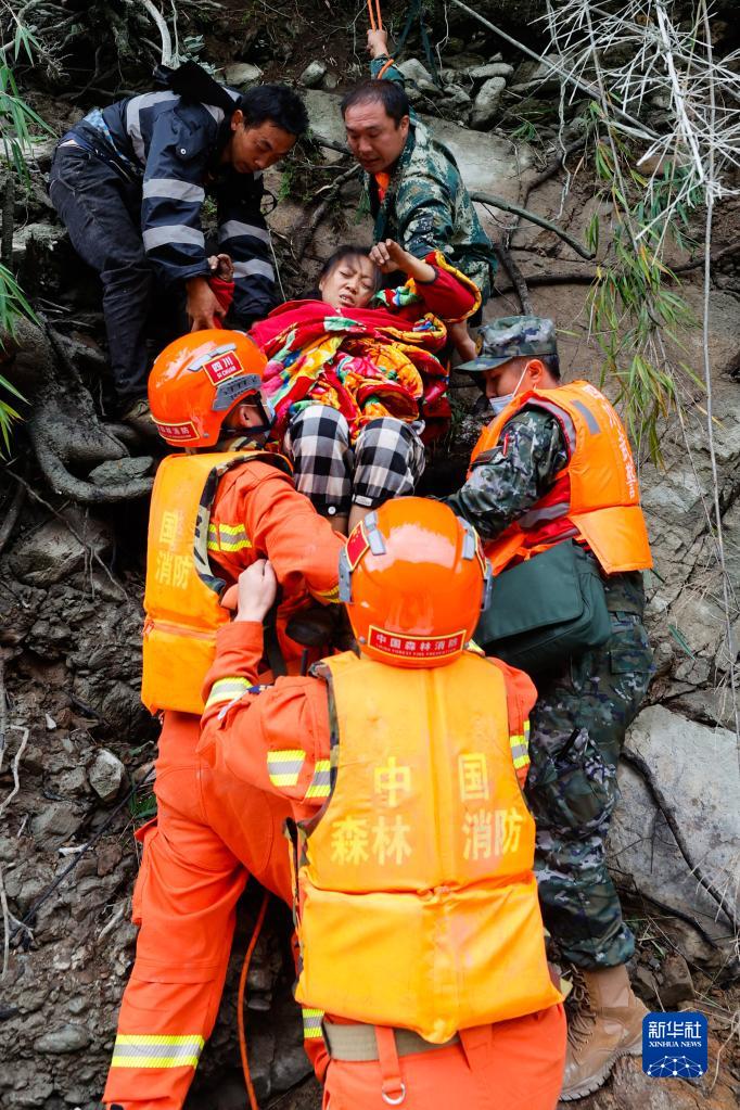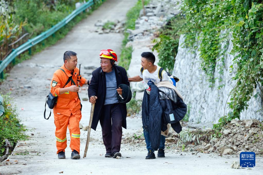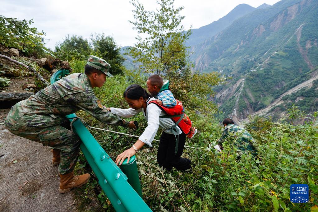 9月6日,救援人員幫助瀘定縣得妥鎮灣東(dong) 村村民向外疏散。新華社記者 沈伯韓 攝
