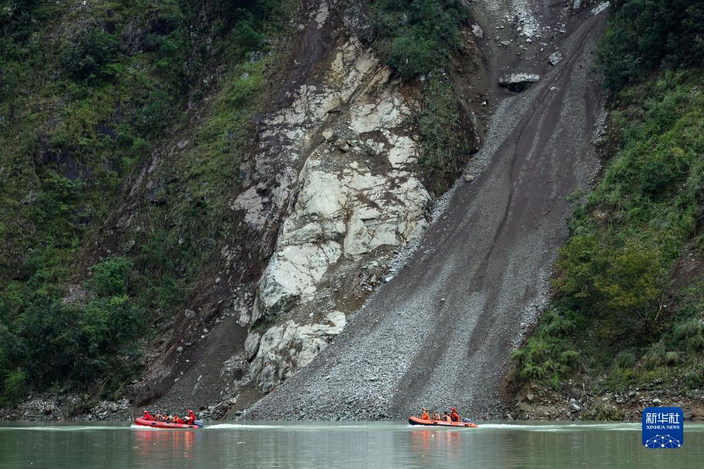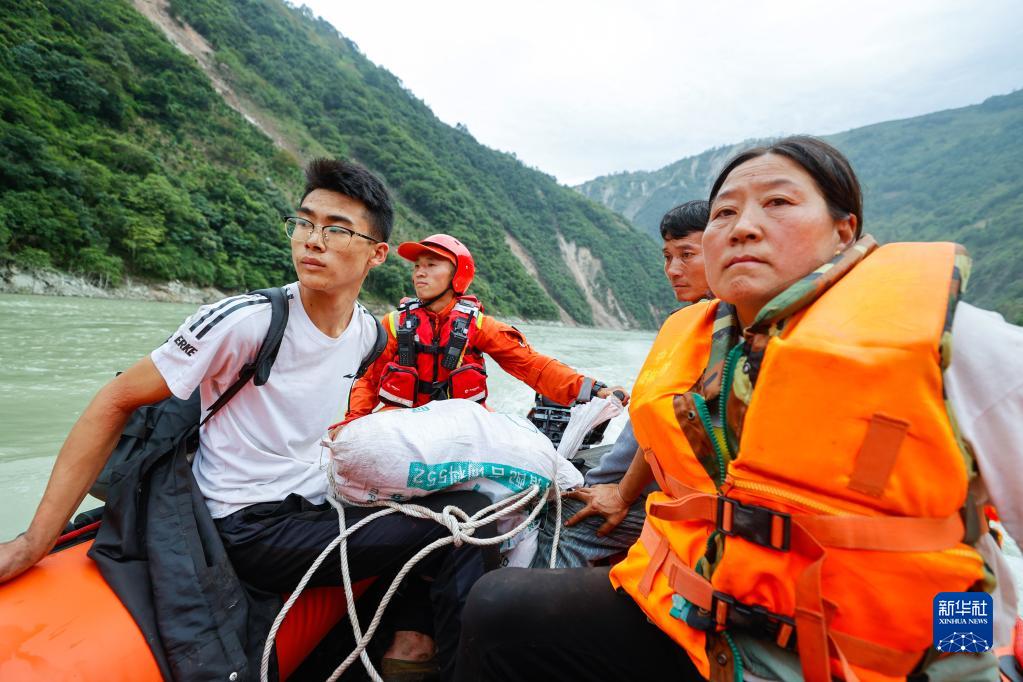 9月6日,救援人員乘坐橡皮艇經水路,再爬山路進入瀘定縣得妥鎮灣東(dong) 村。新華社記者 沈伯韓 攝