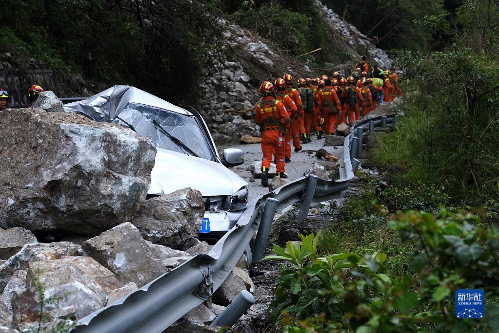 9月6日,在瀘定縣磨西鎮共和村,救援人員徒步進入災區救援。新華社 程雪力 攝