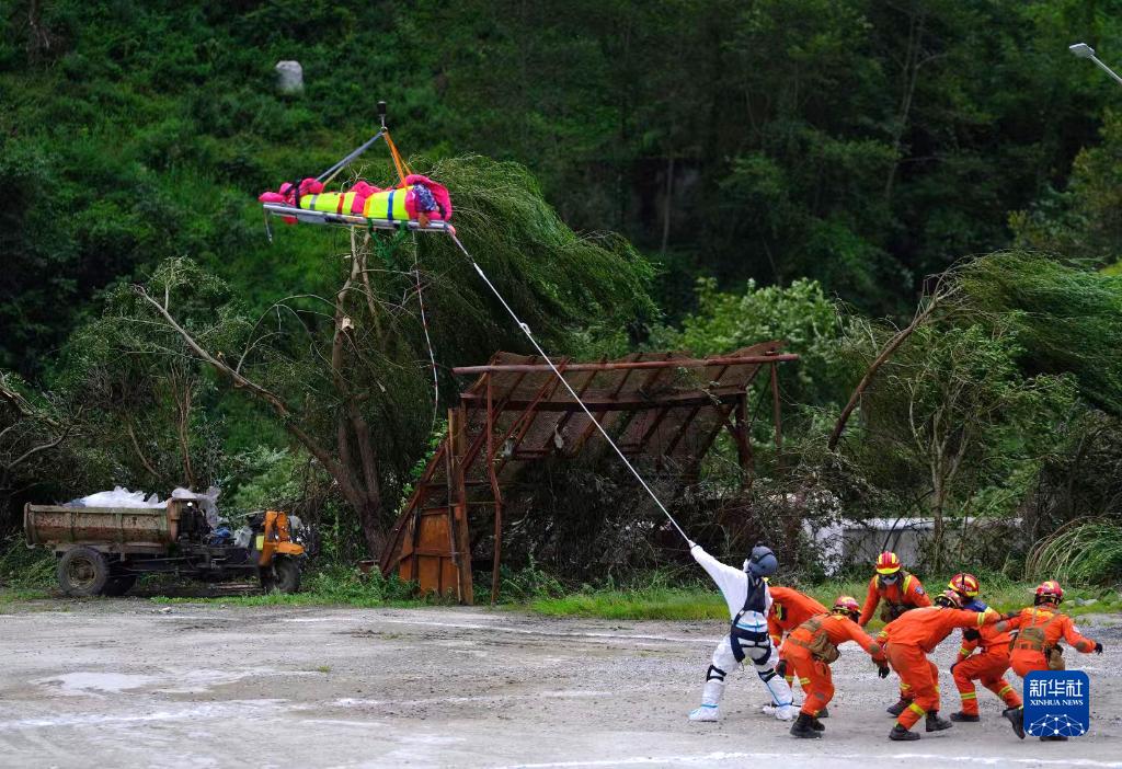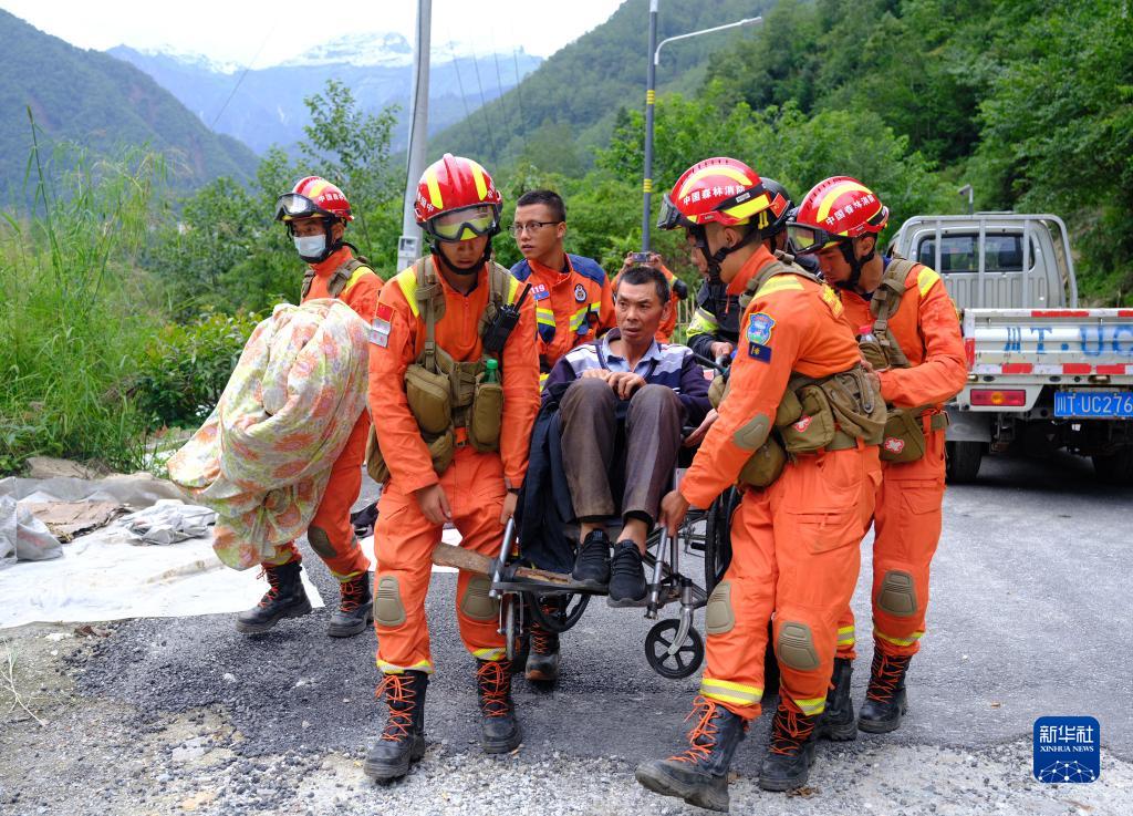 9月6日,在瀘定縣磨西鎮共和村,救援人員轉移傷(shang) 員。新華社 程雪力 攝