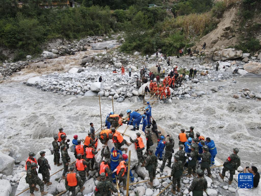 9月6日,武警四川總隊甘孜支隊救援官兵在瀘定縣磨西鎮燕子溝河穀,與多方救援力量一起搭建通往磨子溝村的橋梁。[詳細] -