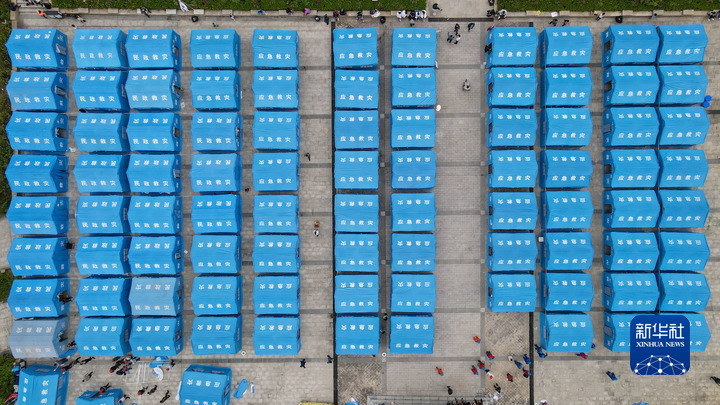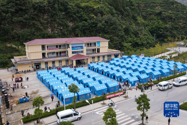 這是9月6日拍攝的位於(yu) 石棉縣王崗坪鄉(xiang) 挖角村村委會(hui) 的安置點(無人機照片)。新華社記者 胥冰潔 攝