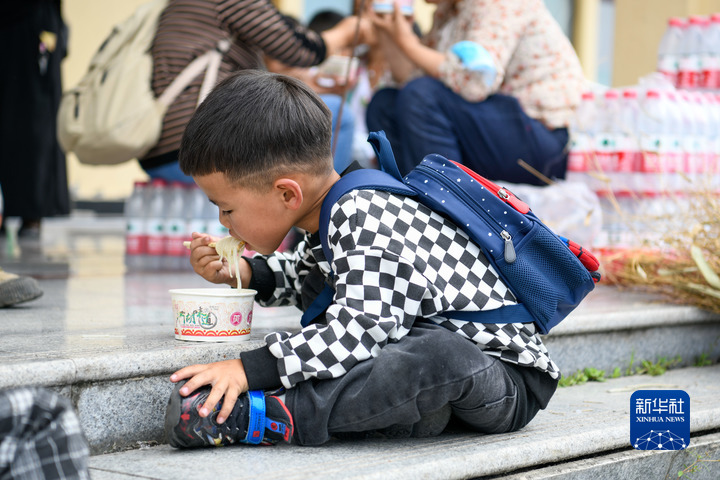 9月6日,在位於(yu) 石棉縣王崗坪鄉(xiang) 挖角村村委會(hui) 的安置點,一名小朋友在吃午飯。新華社記者 胥冰潔 攝