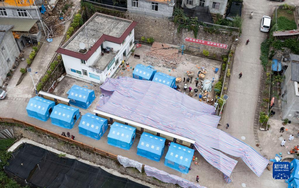 9月7日,在雅安市石棉縣王崗坪彝族藏族鄉(xiang) 幸福村村委會(hui) 小廣場,村民們(men) 搭起帳篷吃住在一起(無人機照片)。新華社記者 才揚 攝