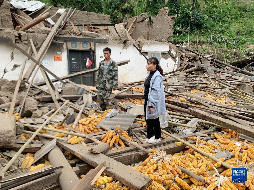 9月7日,在雅安市石棉縣王崗坪彝族藏族鄉(xiang) 幸福村二組,養(yang) 蜜蜂為(wei) 生的康貝兵(左)、陳雲(yun) 夫婦站在倒塌的房屋中。新華社記者 才揚 攝