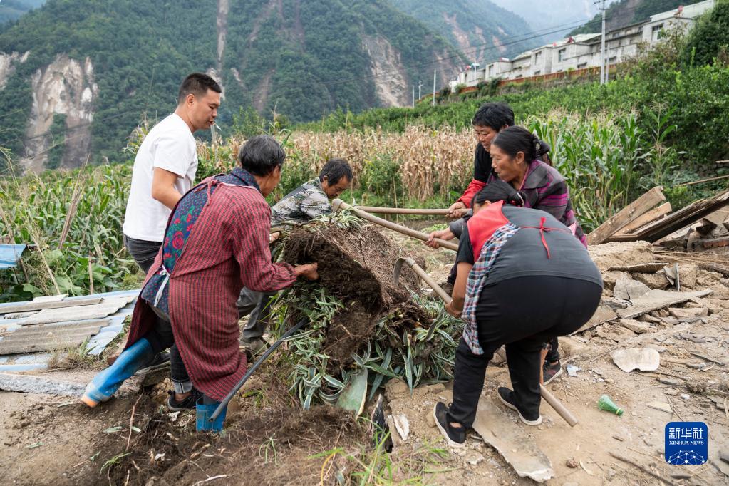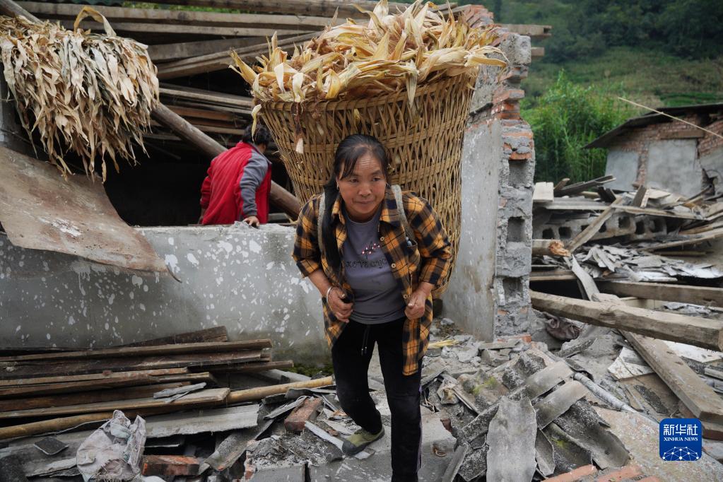 9月7日,在雅安市石棉縣王崗坪彝族藏族鄉(xiang) 幸福村二組,村民在倒塌的豬圈中搬運苞米葉。新華社記者 才揚 攝