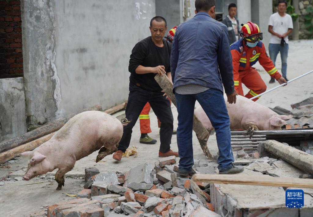 9月7日,在雅安市石棉縣王崗坪彝族藏族鄉(xiang) 幸福村二組,消防救援隊員協助村民從(cong) 倒塌的豬圈中轉移豬。新華社記者 才揚 攝