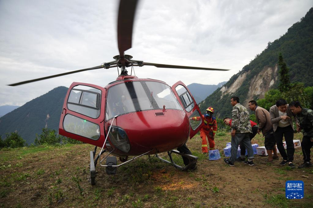 9月7日,在雅安市石棉縣王崗坪彝族藏族鄉(xiang) 幸福村二組,村民與(yu) 消防救援隊員搬運直升機送來的水和食物。新華社記者 才揚 攝