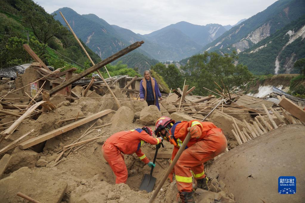 9月7日,四川眉山消防救援隊隊員在雅安市石棉縣王崗坪彝族藏族鄉(xiang) 幸福村二組,幫助村民在倒塌的房屋中找尋物品。新華社記者 才揚 攝