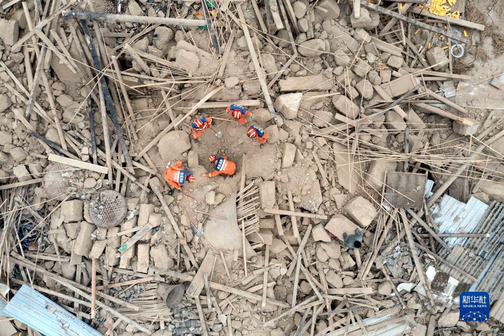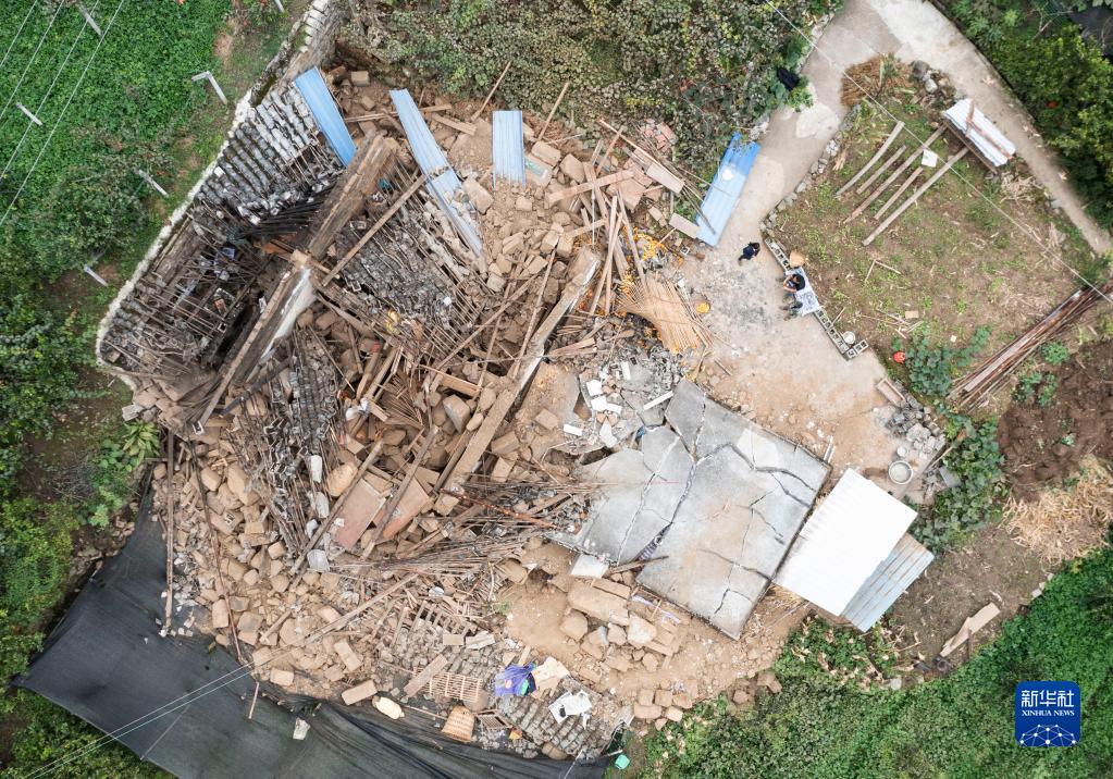 9月7日,在雅安市石棉縣王崗坪彝族藏族鄉(xiang) 幸福村二組,四川眉山消防救援隊隊員幫助村民在倒塌的房屋中找尋物品(無人機照片)。新華社記者 才揚 攝