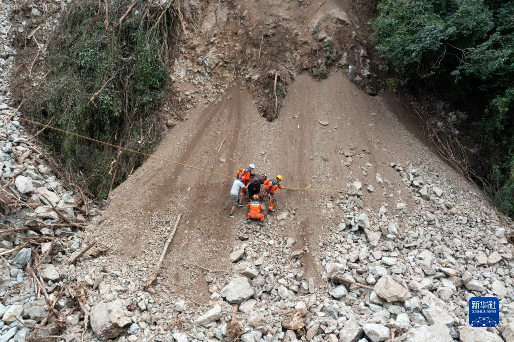 9月7日,在四川省甘孜州瀘定縣磨西鎮附近,四川省成都市消防救援支隊的救援人員轉移被困群眾(zhong) 。 新華社記者 沈伯韓 攝