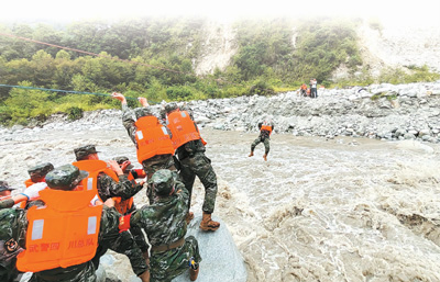 在震中瀘定縣磨西鎮磨子溝村,有部分傷員和群眾被滾滾急流困住。麵對險情,參與救援的一線特警隊員毫不猶豫,用身體和繩索搭起“生命通道”,迅速轉移被困群眾。[詳細] -