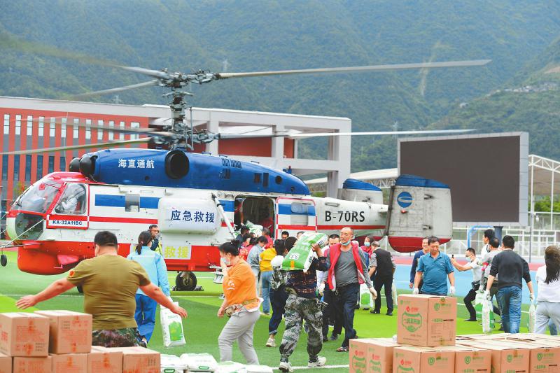 通往石棉縣草科鄉(xiang) 的空中“生命通道”——直升機運送救援物資。 四川日報全媒體(ti) 記者 王雲(yun) 攝