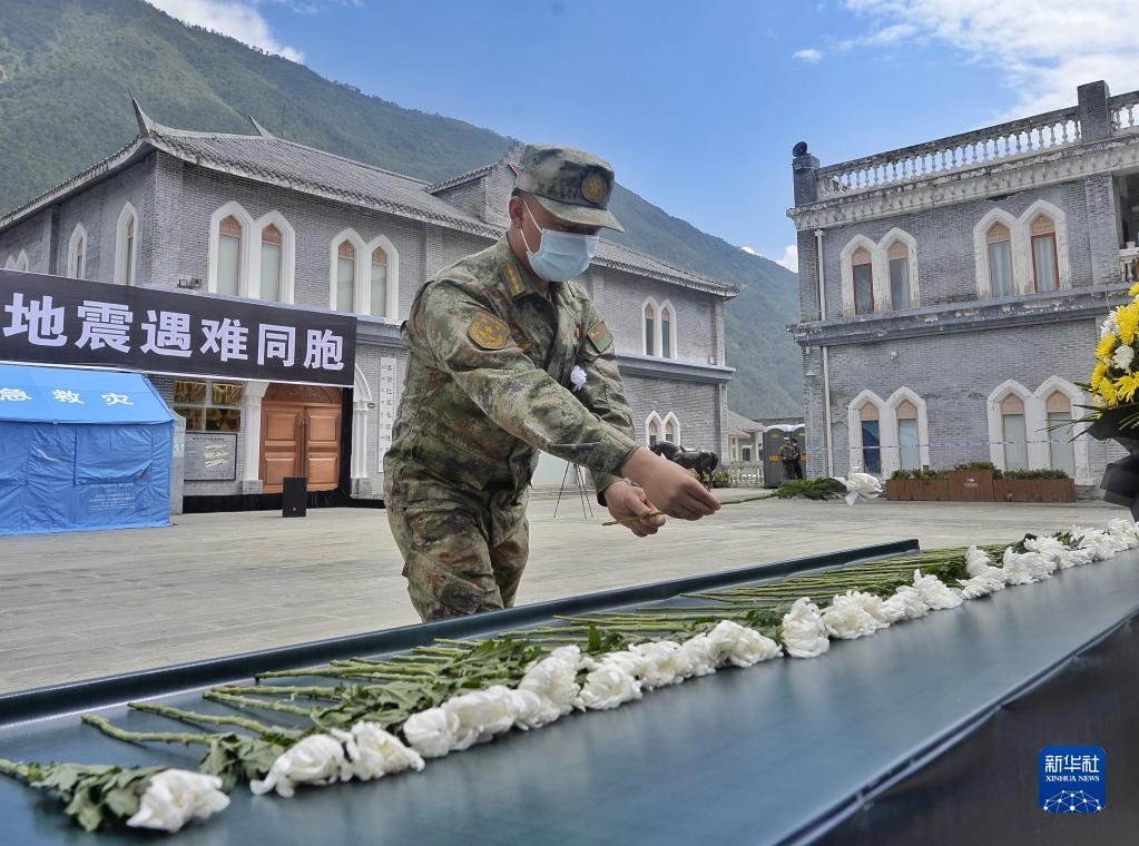 9月12日,在瀘定縣磨西鎮,參加悼念活動的人員向遇難同胞獻花。 新華社記者 劉坤 攝