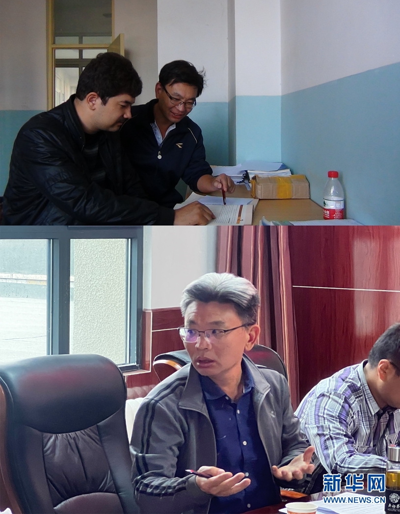 這是一張拚版照片:上圖為(wei) 2014年6月23日,趙焱(右)與(yu) 和田縣第二中學青年教師一起交流(新華網發 受訪對象供圖);下圖為(wei) 2022年3月31日,趙焱(左)在玉樹州教育局參加玉樹州高三備考會(hui) 。(新華網發 受訪對象供圖)