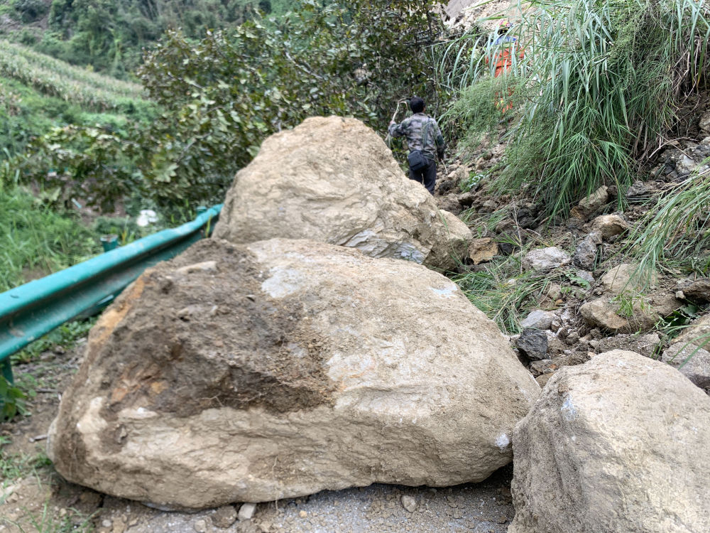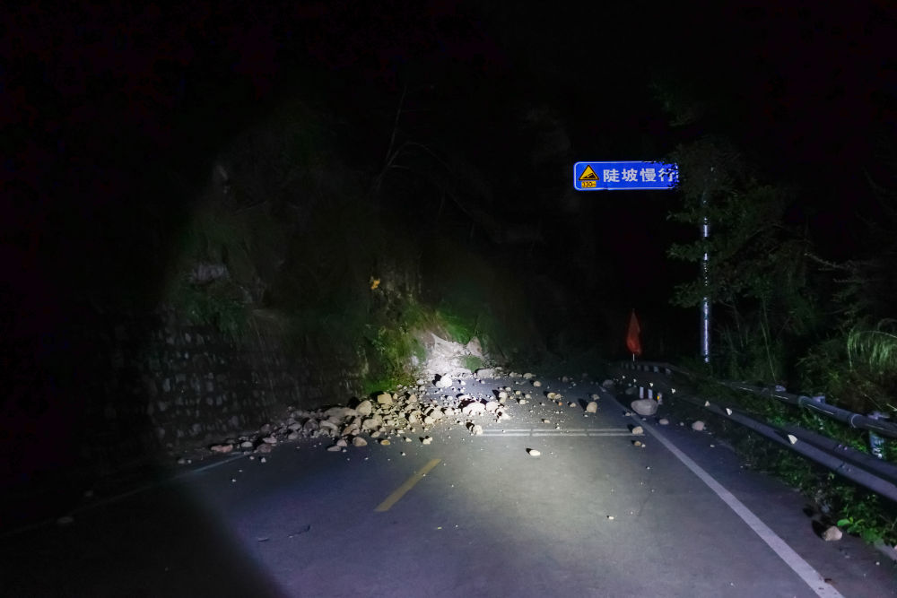 9月6日淩晨,通往得妥鎮的公路上,隨處可見震山體(ti) 塌方後落下的碎石。