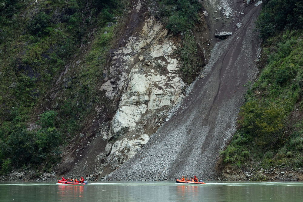 9月6日,救援人員乘坐橡皮艇經水路,再爬山路進入灣東(dong) 村。
