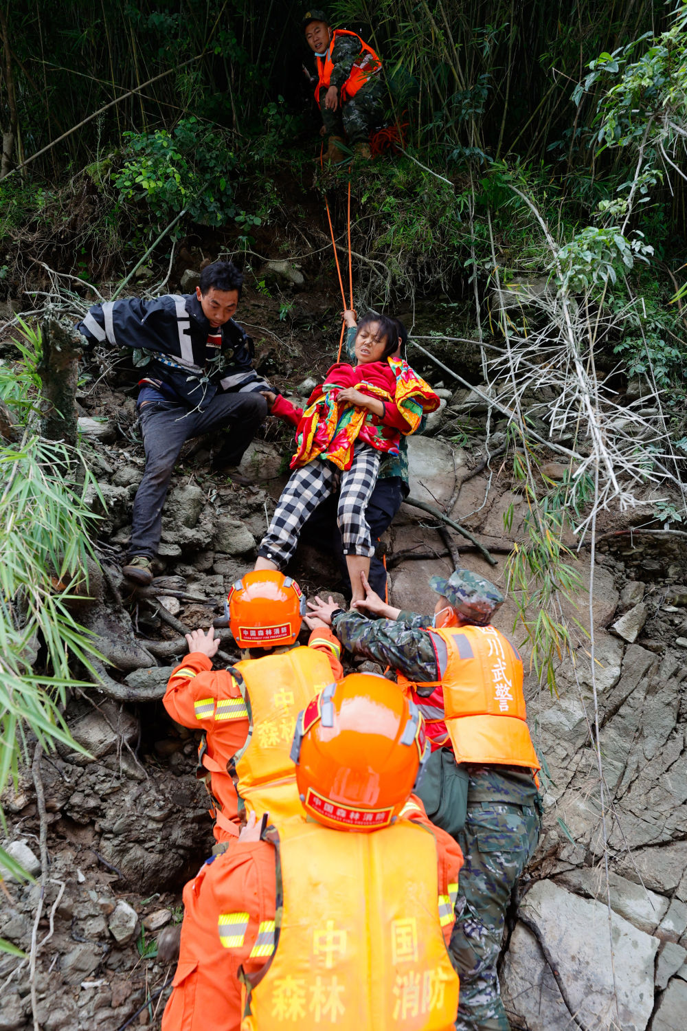 穿越了十餘(yu) 個(ge) 這樣的路段,遠遠看到山下有人影晃動在齊人高的綠色植物之間,再往山上走。向導說他們(men) 是從(cong) 灣東(dong) 村一組上來的被困群眾(zhong) 。透過長焦鏡頭看到,一名精壯的小夥(huo) 子赤裸上身,拿著鐮刀走在最前麵為(wei) 鄉(xiang) 親(qin) 們(men) 開路,鄉(xiang) 親(qin) 們(men) 跟在後頭,有的還背著孩子。幾名救援人員在變形的公路護欄旁接爬上來的人,一名背著孩子的婦女一握到解放軍(jun) 戰士的手就哭了出來……待這批村民全部上到公路上後,救援人員護送他們(men) 返回紅花崗附近可以停直升機的疏散地點,然後再去山下接人。