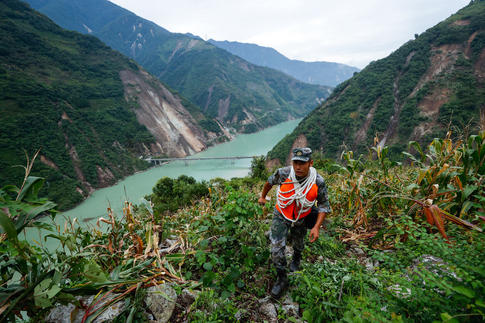 下直升機後,我馬上拍攝了運送村民傷(shang) 員的照片與(yu) 視頻,又跟隨資陽消防隊隊員一起徒步兩(liang) 個(ge) 小時趕到一個(ge) 老人的家中進行救援和采訪拍攝,這裏位於(yu) 大山深處,道路基本全部坍塌,山體(ti) 大規模滑坡,消防隊員帶我爬過數個(ge) 陡峭滑坡路段,我們(men) 就像走在一個(ge) 直角三角形的斜邊上,每走一步都會(hui) 帶起一堆砂石滾落到山澗裏。我當時顧不得害怕,一心想著趕到目的地把照片拍好……現在敲著這行字時回想起當時的情況,我的手心還是冷汗直流。