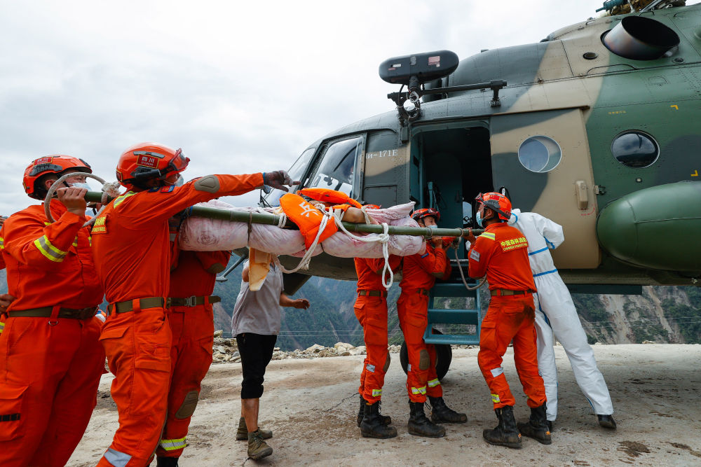 9月6日,救援人員抬著一名從(cong) 灣東(dong) 村疏散出來的受傷(shang) 村民,準備通過直升機將其運出。