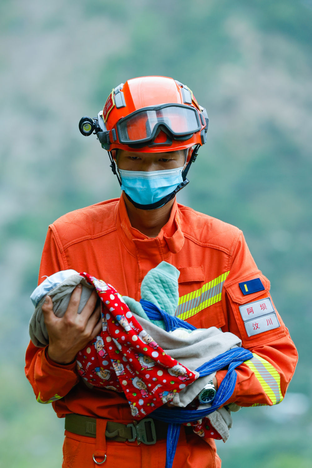 9月6日,阿壩森林消防支隊汶川大隊隊員張自立抱著一名從(cong) 灣東(dong) 村疏散出來的兩(liang) 個(ge) 月大的嬰兒(er) 。