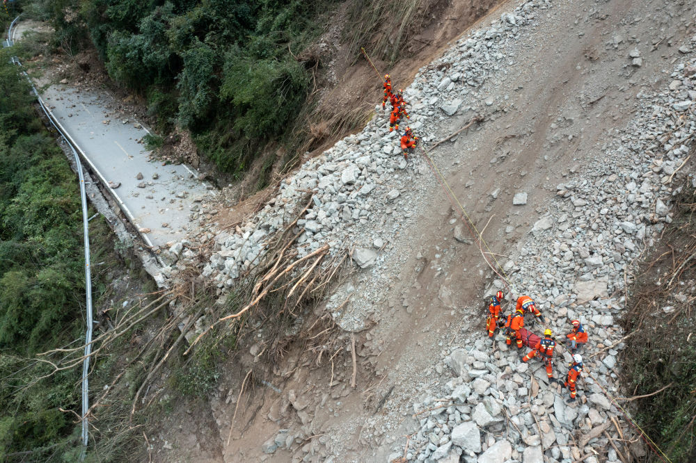 9月6日,救援人員攀爬高山,向灣東(dong) 村挺進。