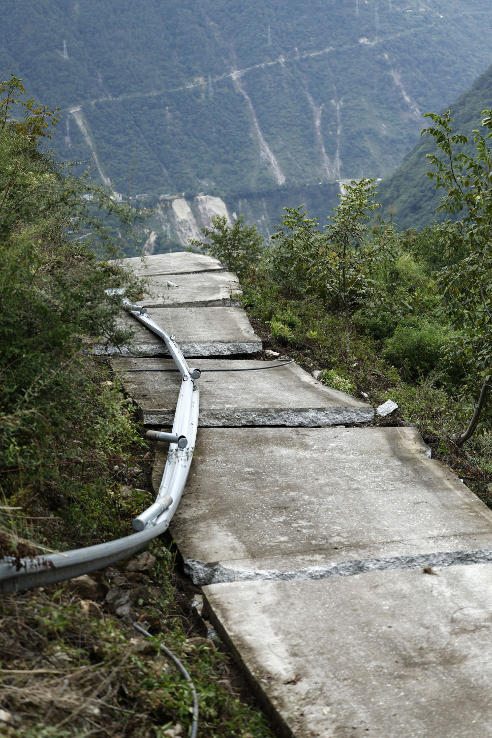 得知我們(men) 要去共和村,村幹部叫來三輛摩托車,給車加了點汽油,送我們(men) 上去。上山的路本是隻能容一輛汽車通過的水泥硬化路,經過地震,沿途路麵或裂開、或傾(qing) 斜、或拱起、或塌陷,滑落的巨石和被撕扯下來的樹木把小路擋得隻容摩托車通過,另一側(ce) 就是深深的山溝。