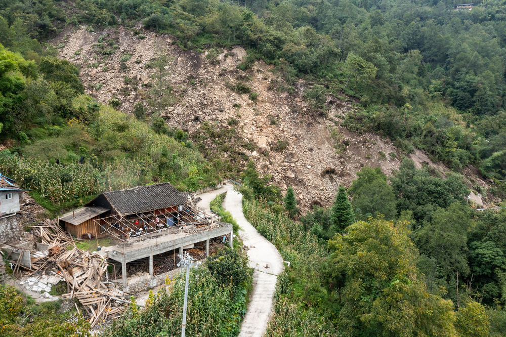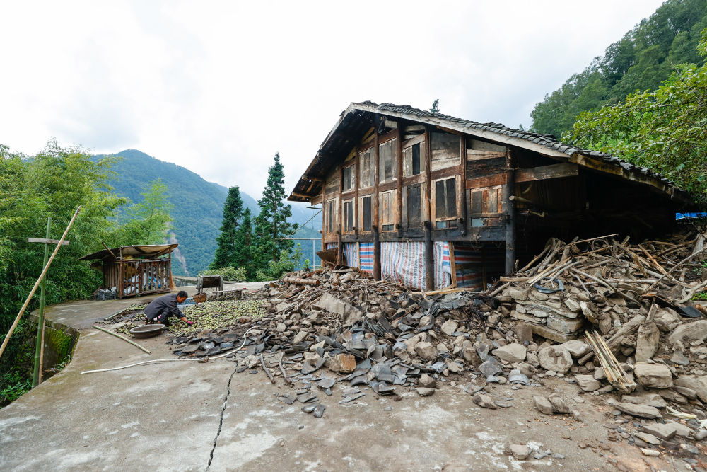 9月8日,共和村一組被地震損壞的民房。旁邊坍塌的山體(ti) 本是盤山公路,如今已隱入山中不複存在。