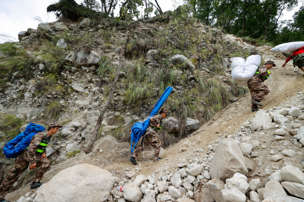 9月8日,在磨西鎮附近,救援人員沿著被地震損壞的小路向共和村運送救災帳篷。