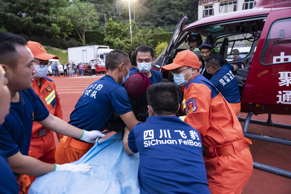 9月6日,在石棉縣中學的臨(lin) 時起降點,救援人員在運送一名從(cong) 石棉縣幸福村轉運來的受傷(shang) 老人。