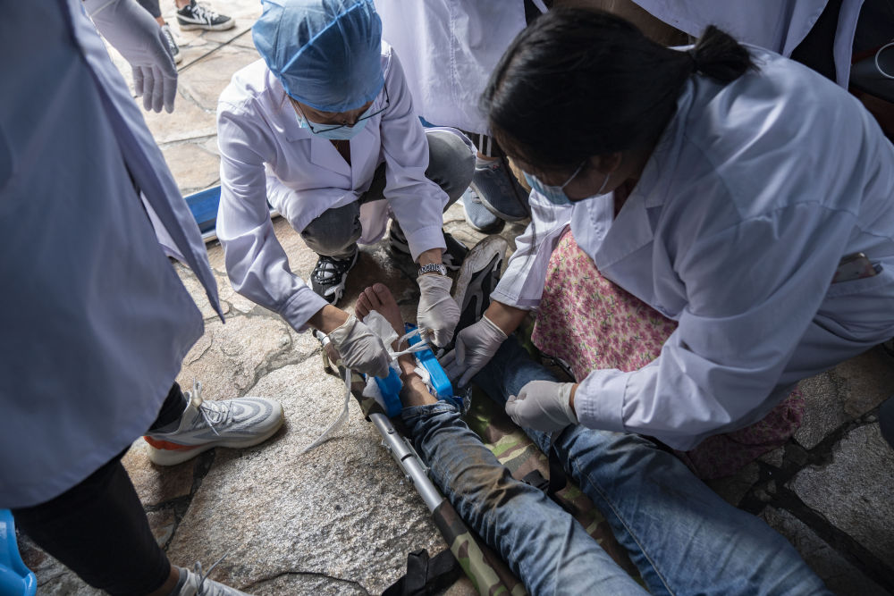 9月6日,在磨西鎮海螺溝廣場受災群眾(zhong) 臨(lin) 時安置點,醫護人員為(wei) 傷(shang) 員包紮。