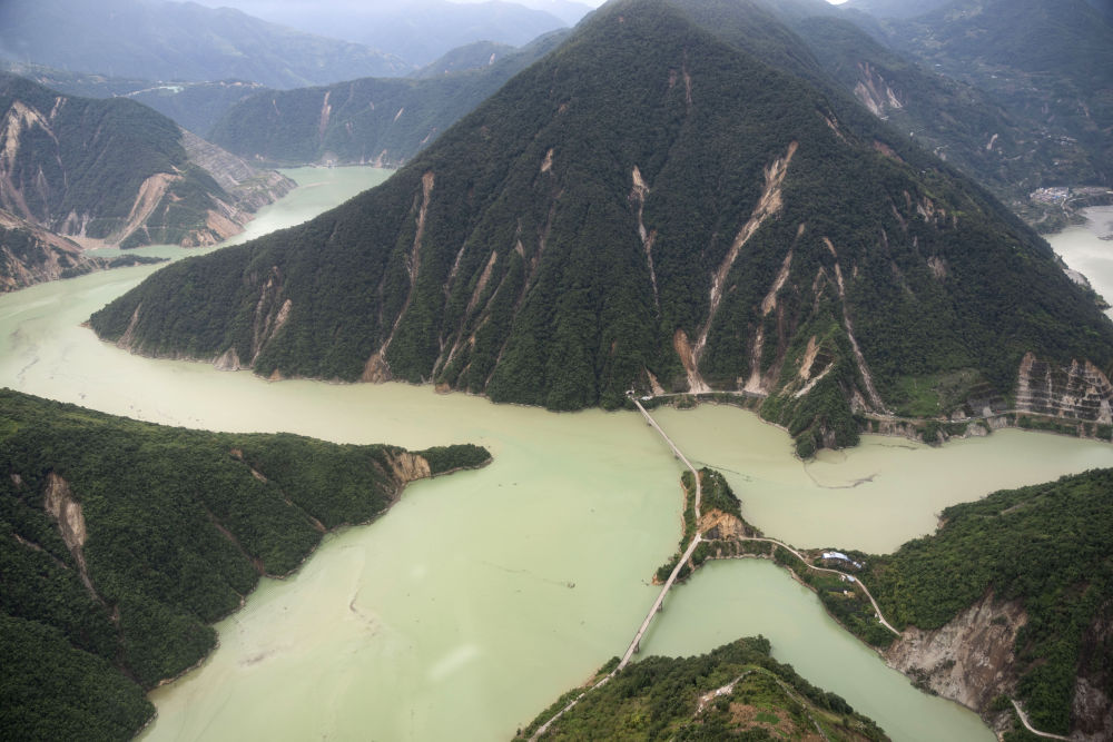 恍惚間被手機鬧鍾吵醒,趕緊起來收拾好裝備,搭乘武警四川總隊機動第二支隊的車,前往救援力量集結的聯合村隧道口處。通過無人機可以看到,大渡河對岸的一個(ge) 山穀裏,山體(ti) 塌方帶下來的泥土和石頭幾乎覆蓋了山穀的底部,一些民房被淹沒其中,泥水還在不停地往下流,將破碎的樹枝等雜物衝(chong) 入大渡河;岸邊的公路損毀嚴(yan) 重。