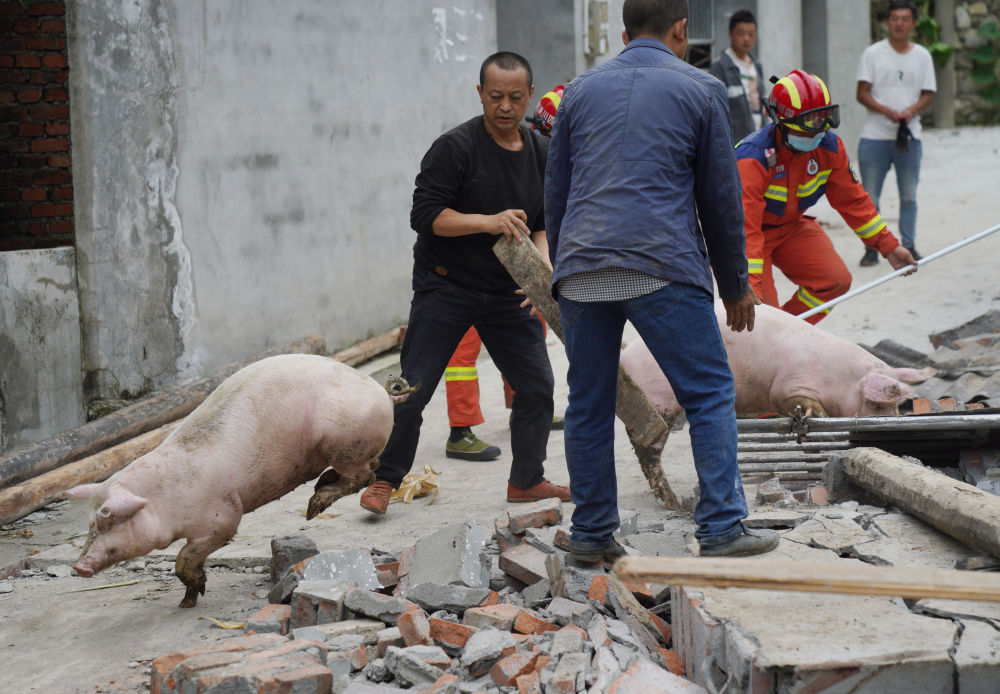 9月7日,在幸福村二組,消防救援隊員協助村民從(cong) 倒塌的豬圈中轉移豬。