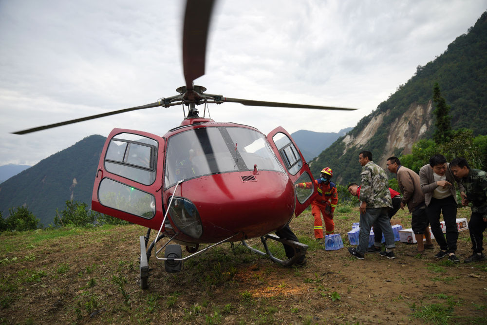 9月7日,在幸福村二組,村民與(yu) 消防救援隊員搬運直升機送來的水和食物。