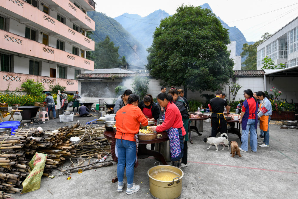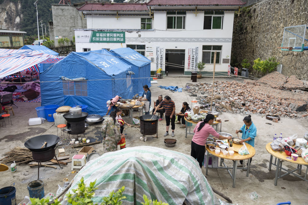 9月7日,在草科鄉(xiang) 政府安置點內(nei) ,當地群眾(zhong) 為(wei) 在場救援人員準備飯菜。
