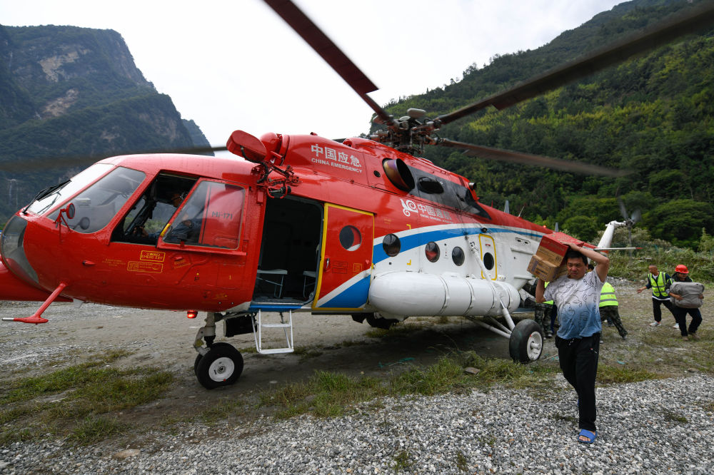 9月7日,搭載方便麵和帳篷等救援物資的直升機抵達石棉縣草科鄉(xiang) ,當地群眾(zhong) 搬運物資。