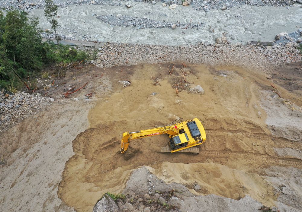 9月7日,在磨西鎮附近,四川路橋的工作人員在搶修通往海螺溝景區的道路(無人機照片)。
