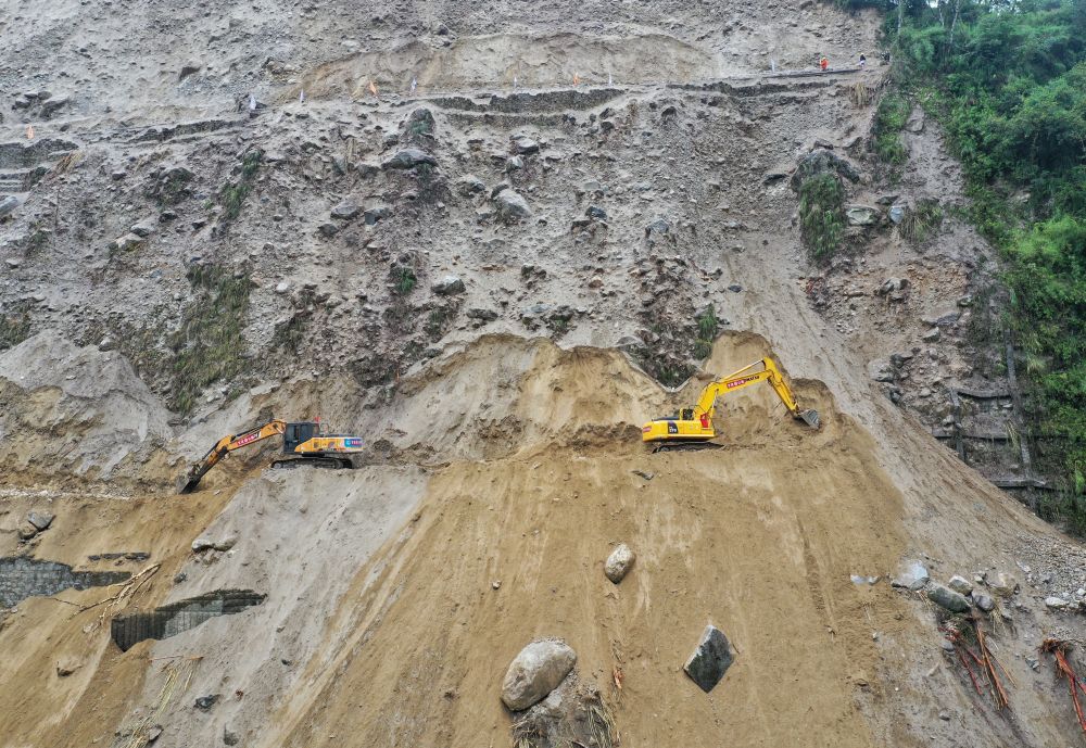 9月9日,搶險人員在搶通磨西鎮附近道路。