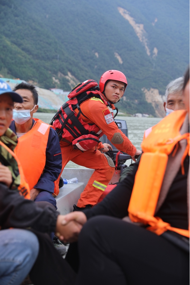 大渡河水奔湧流去,但穿梭於(yu) 各個(ge) 村莊間的救援人員毫無畏懼。我們(men) 隨救援人員一起坐上衝(chong) 鋒舟,兩(liang) 岸的山上不斷有滾石滑落。