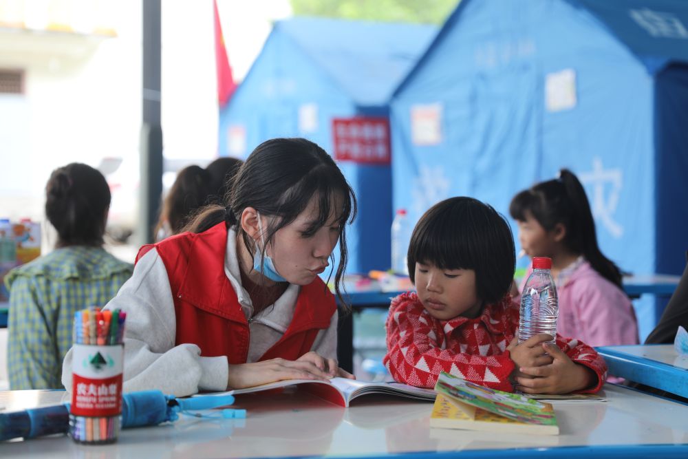 9月9日,在王崗坪鄉(xiang) 安置點內(nei) ,誌願者在給小朋友講故事。