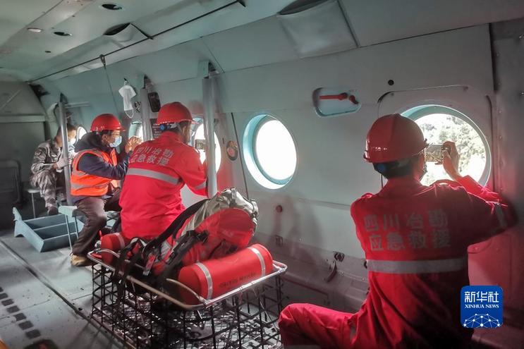 9月7日,四川省冶勘設計集團有限公司的調查隊員在前往海螺溝景區的直升機上拍攝。新華社發(四川省冶勘設計集團有限公司供圖)