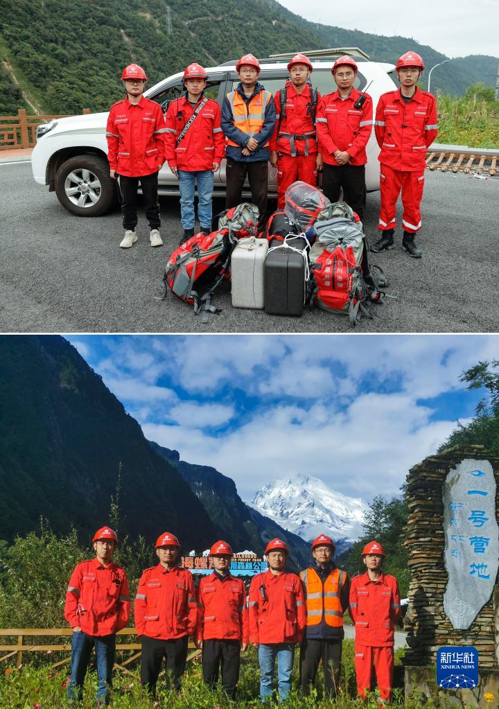 這是一張拚版照片,上圖為(wei) :9月7日,四川省冶勘設計集團有限公司的6名調查隊員在搭乘直升機去往海螺溝前拍攝的合影(新華社記者沈伯韓攝);下圖為(wei) :9月10日,6名調查隊員在海螺溝景區一號營地拍攝的合影(四川省冶勘設計集團有限公司供圖)。新華社發