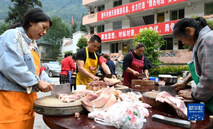 9月7日,在石棉縣草科鄉(xiang) 政府,李有琴(左一)與(yu) 鄉(xiang) 親(qin) 一起備菜。新華社記者 胥冰潔 攝